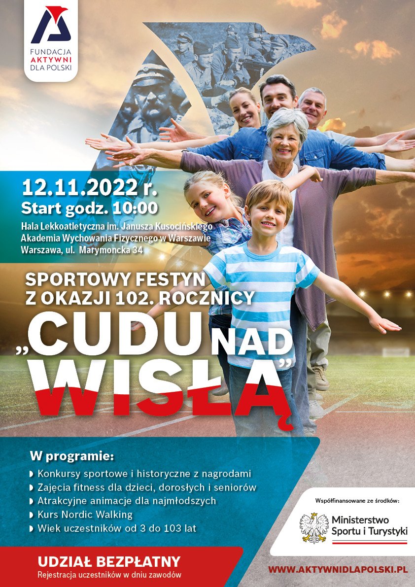 Fundacja Aktywni dla Polski zaprasza na wyjątkową imprezę dla całych rodzin, która odbędzie się w dniu 12 listopada, w godzinach 12 – 16, w hali lekkoatletycznej warszawskiej AWF przy ulicy Marymonckiej 34. W programie przewidziano rywalizację sportową dla dzieci z roczników 2007-2015, a także szereg atrakcji dla całych rodzin, które przyjdą na to wydarzenie z uczestnikami poszczególnych konkurencji. Dzieci będą startować w biegach na 60, 200, 400 i 800 metrów, a także w skoku w dal i w skoku wzwyż.