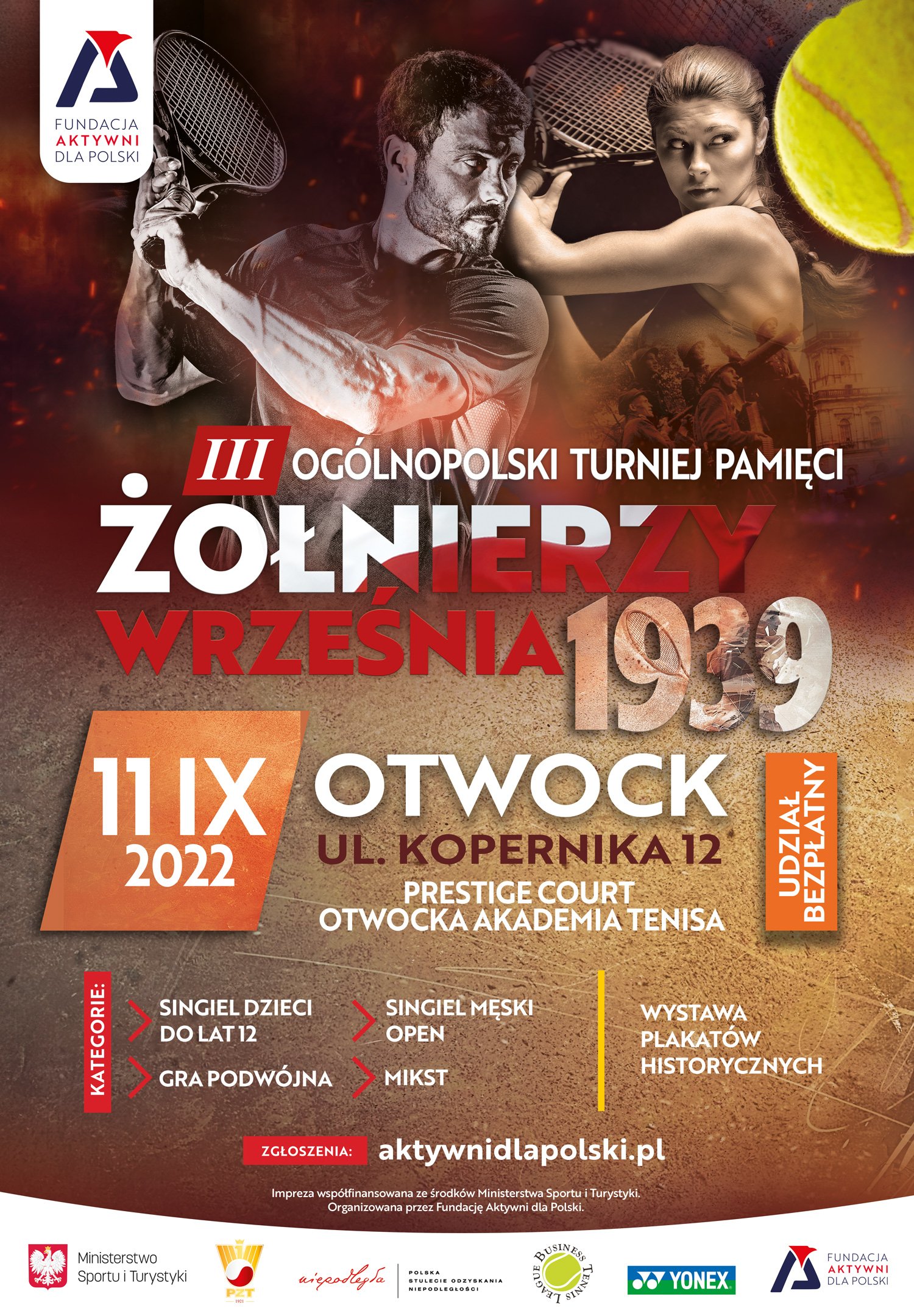 Fundacja Aktywni dla Polski zaprasza na trzecią edycję Turnieju Pamięci Żołnierzy Września 1939 zorganizowanego dzięki wsparciu Ministerstwa Sportu i Turystyki pod patronatem Polskiego Związku Tenisowego. Turniej odbędzie się w dniu 11 września 2022.