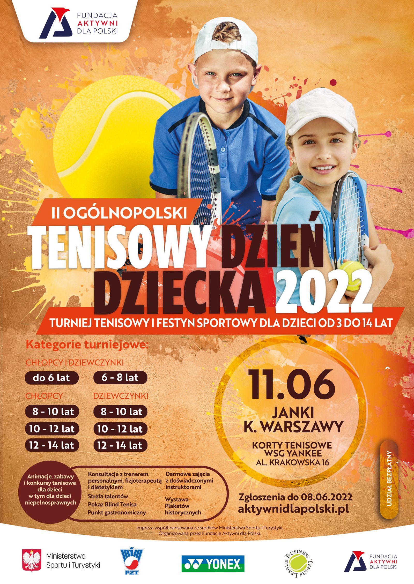 Fundacja Aktywni dla Polski zaprasza na drugą edycję Tenisowego Dnia Dziecka zorganizowanego dzięki wsparciu Ministerstwa Sportu i Turystyki pod patronatem Polskiego Związku Tenisowego.